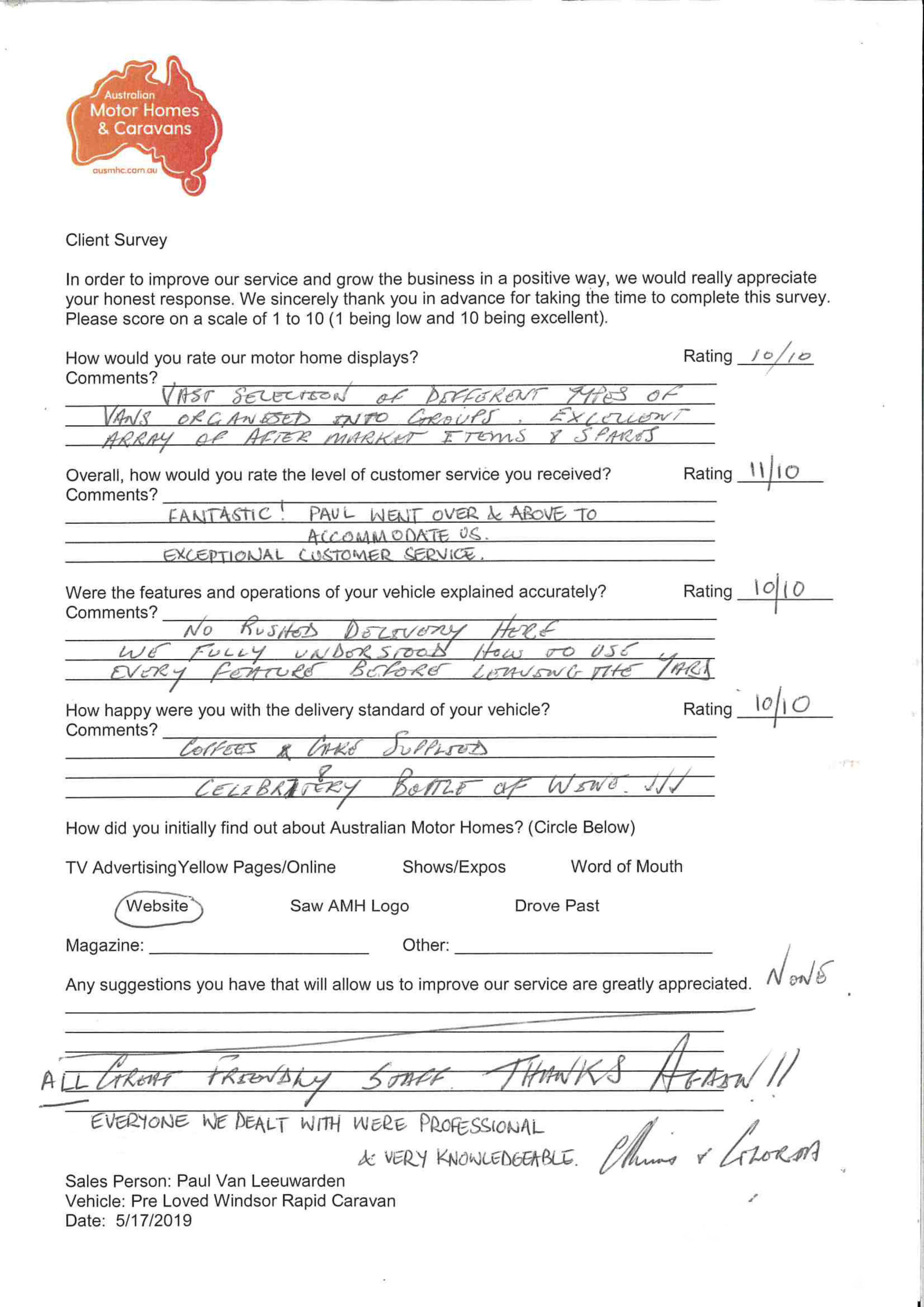At Australian Motor Homes & Caravans we pride ourselves on the level of service we provide to our customers. We love to get feedback about our services so