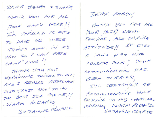 Subject: Thanks from Hugh and LisaHi George,We wanted to drop you a line to say thank you for organising everything with the van. This morning went well and we got the van home in some pretty windy conditions.We are very happy with our purchase and would like to thank you for your professional approach throughout the process.Kind regards Hugh and Lisa